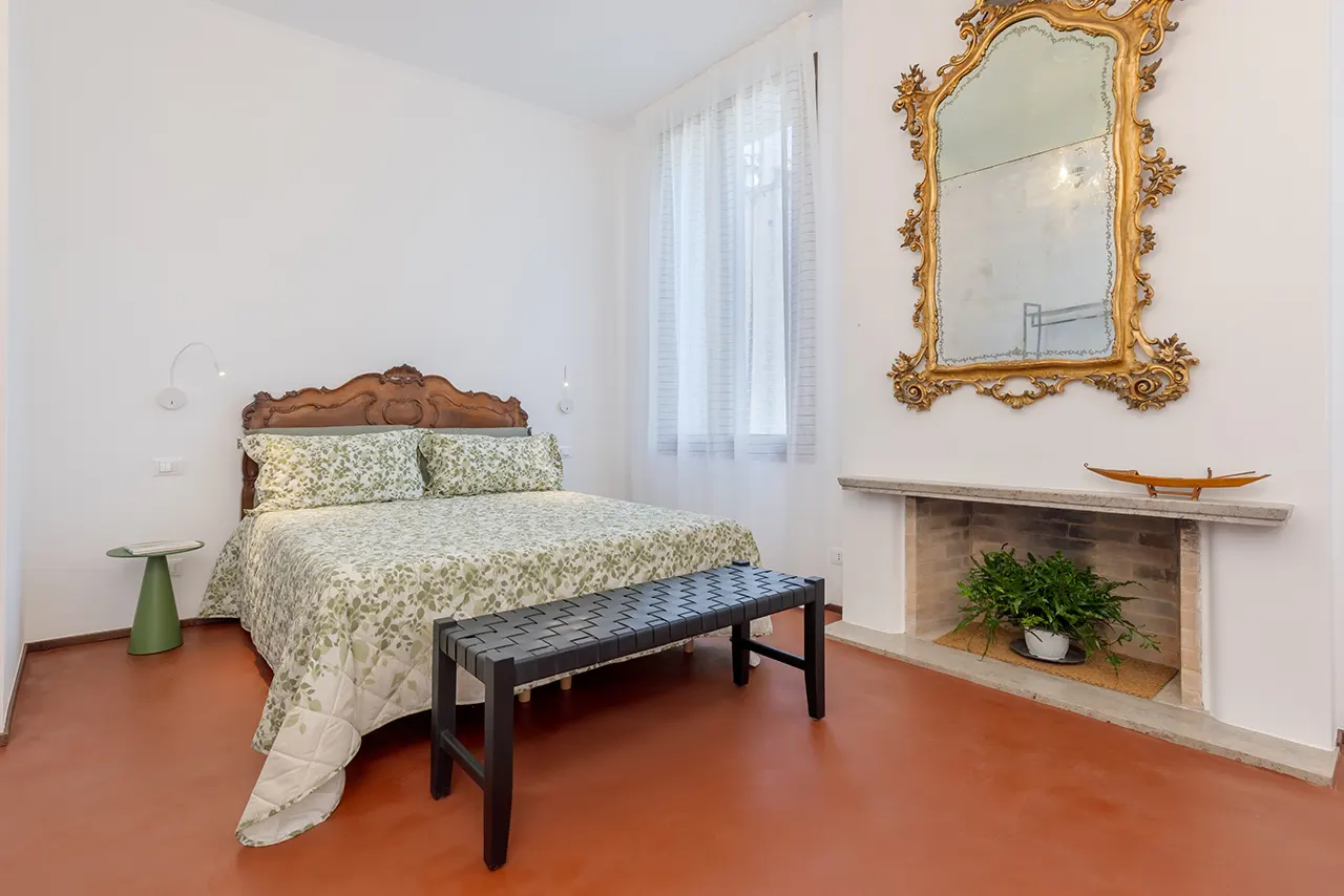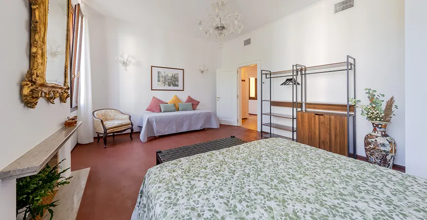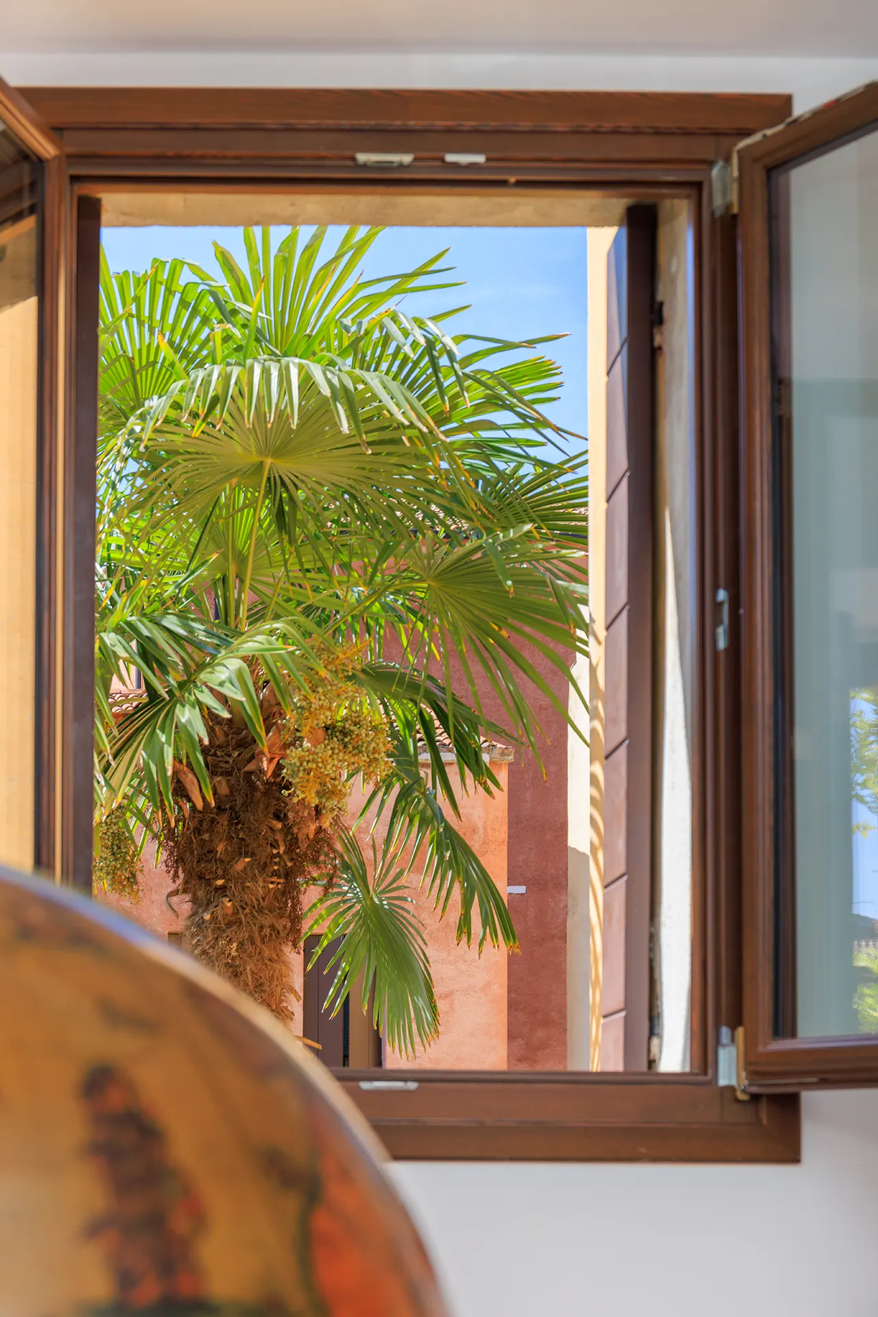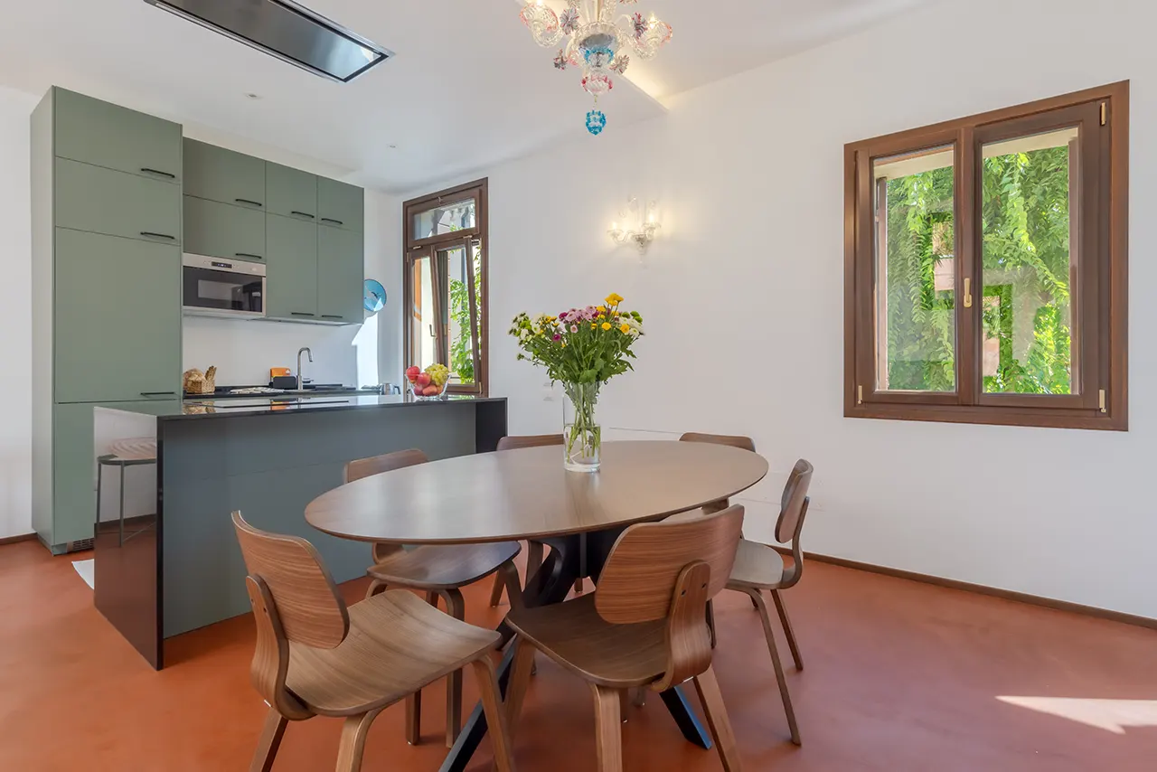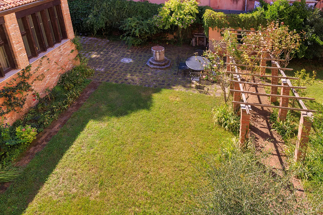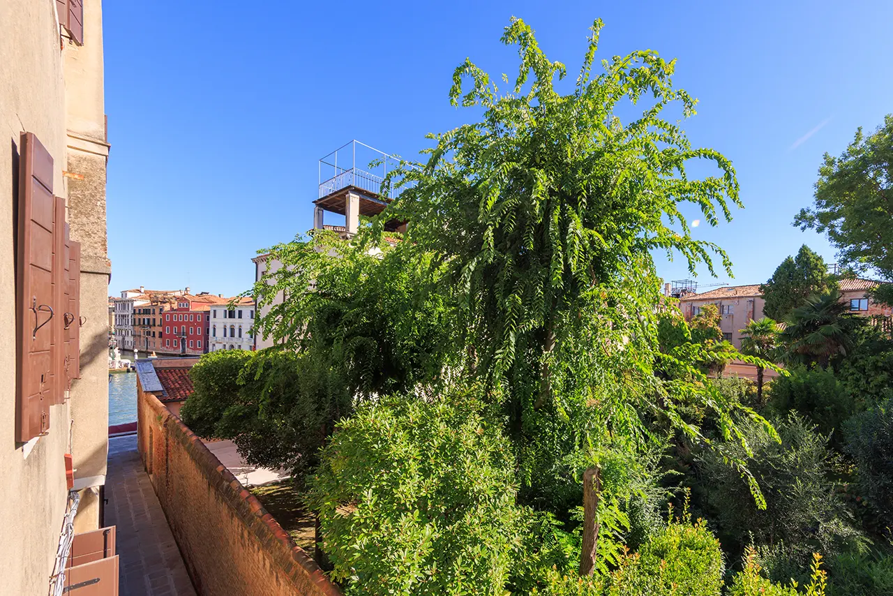 This 136 m2 apartment is filled with natural light and embraced by the beauty of two secret gardens, an uncommon luxury in Venice. Secluded among treetops, it offers